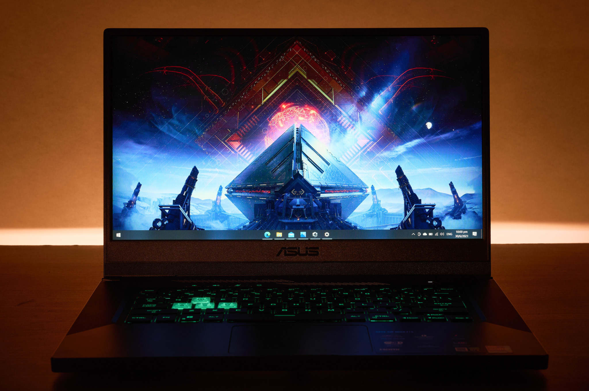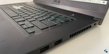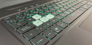 در قسمت چپ لپتاپ چهار دکمه برجسته و شیشهای برای کاربران خودنمایی میکند. کلیدهای WASD شفاف هستند و کلید W دارای یک بریدگی ظریف است تا هنگام بازی عملکرد راحتی داشته باشید. کیبورد این مدل دارای نور پس زمینه است و به لطف اندازه بزرگ، فاصله استاندارد کلیدها و عمیق تقریبی 1.7 میلیمتری، امکان تایپی راحت برای شما فراهم میشود. نور پس زمینه کیبورد قابل تنظیم نیست. در این میان، چند کلید اضافی در بالای صفحه کلید، از جمله دکمه صدا، بی صدا کردن میکروفون و میانبر حین بازی کردن دیده میشود. ترک پد سیستم را باید به طور اخص خوب نامید چرا که هنگام کار کردن با آن دچار هیچ مشکلی نخواهید شد.